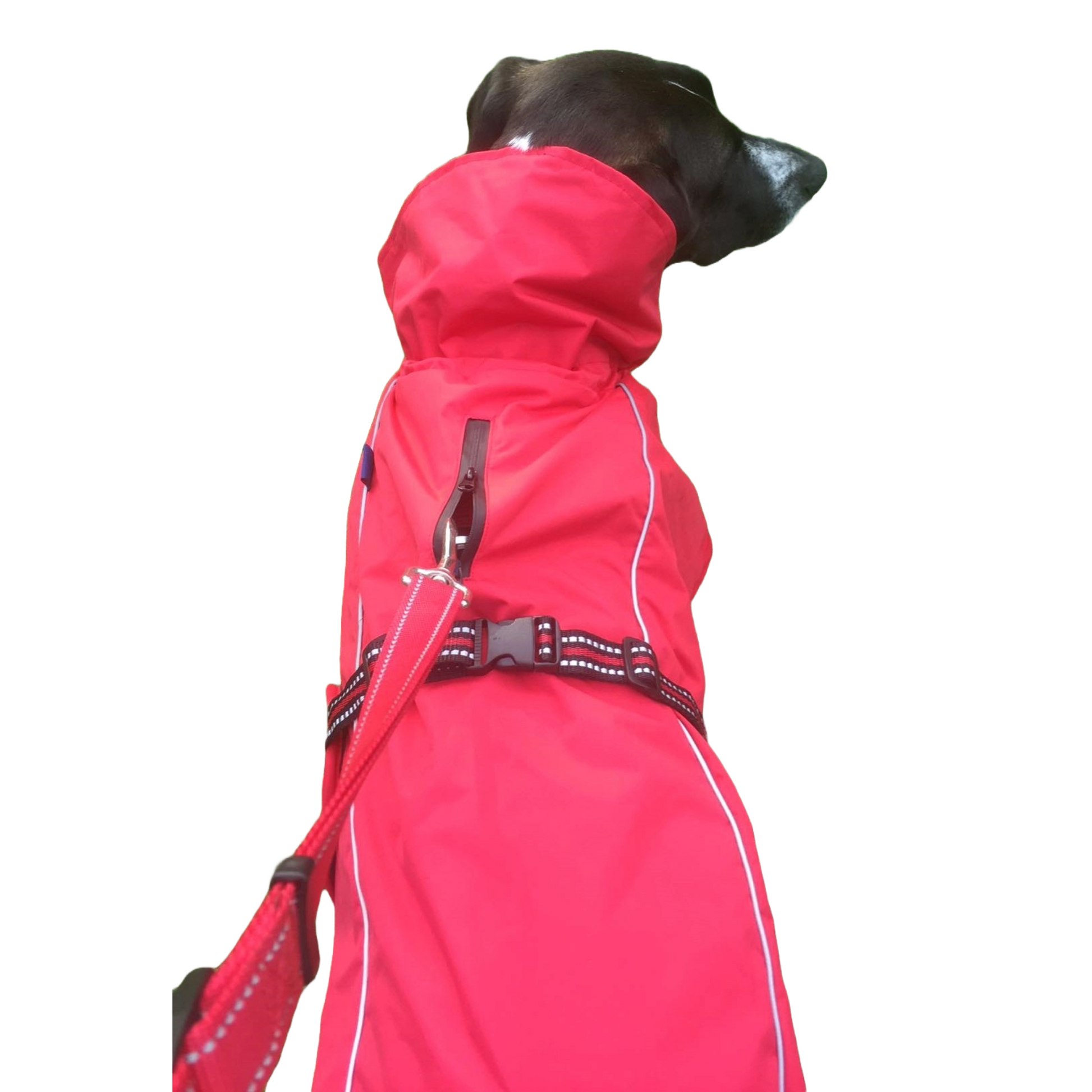 It has a top and front D ring for owners who like to use the front D ring to help train a dog to stop pulling. The raincoat has light reflective strips and elasticated front panels to add protection against the elements while still allowing natural movement. It also has elasticated, adjustable leg straps and is water proof and wind proof.